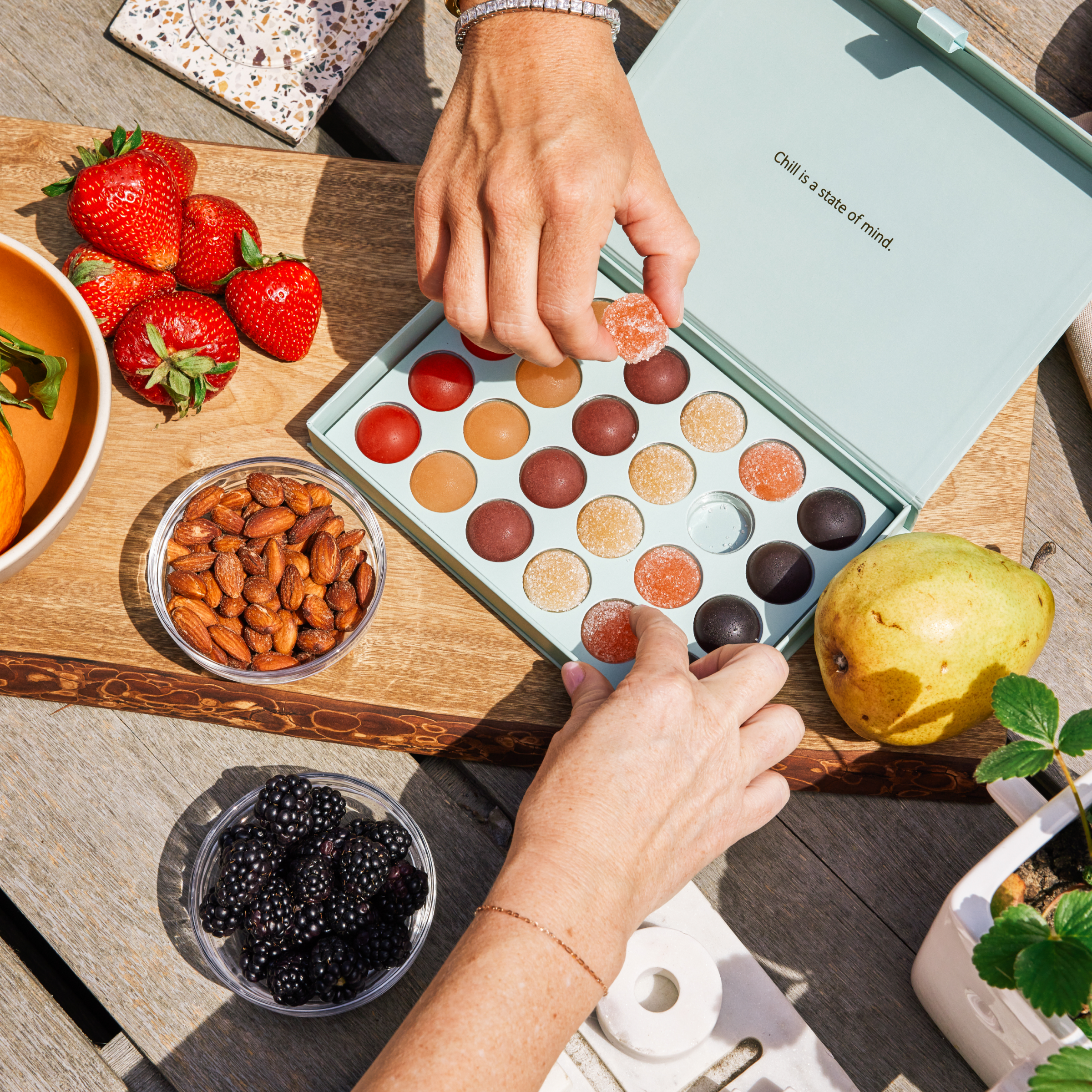 Inspired by the luxurious gift of a box of chocolates, with a little more chill. The Molly J. Botanical Big Box includes 24 Chill Formula gumdrops in six of our bestselling flavors. It's more than just a sweet treat -- all gumdrops are infused with our proprietary Chill Formula, a blend of Magnesium, GABA, and L-theanine for relaxation, calm, and stress relief. Send it to your sweetheart, stash it for yourself — this is the big dose of delicious self-care that everyone deserves. Includes four gumdrops each of our signature Berry, Lemon Lavender, Plum Cardamom, Sparkling Pomegranate, Elderflower Grapefruit, and Pear Ginger.